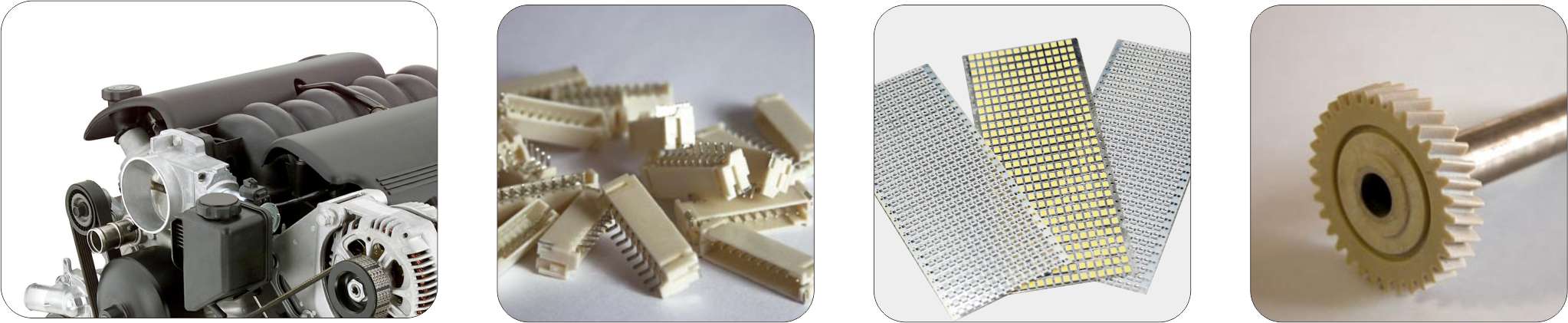 汽车领域:汽车电机、端盖、ABS感应器、发电机冷却系统等各支座、ABS/TSC/ESP轴心、离合器辅助油缸、蝶阀、??废气循环阀外壳、节流阀外壳、大灯、雾灯外壳、灯泡插座、雨刷臂、进气歧管、热交换机底盖、辅助加热器的绝缘材料等。