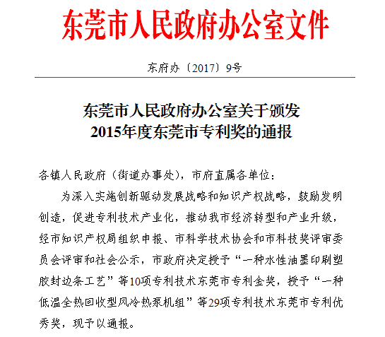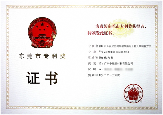 2017年,东莞市继续高标准建设国家知识产权示范城市,深入实施创新驱动发展战略和知识产权战略,大力推进专利质量提升工程。在此背景下,2017年2月,九游老哥J9俱乐部官网凭借“可低温成型的聚碳酸酯组合物及其制备方法”的专利技术获得了东莞市政府授予的“东莞市专利优秀奖”。充分彰显了九游老哥J9俱乐部官网在新材料技术研究领域的实力以及九游老哥J9俱乐部官网人不断开拓探索的科研精神。